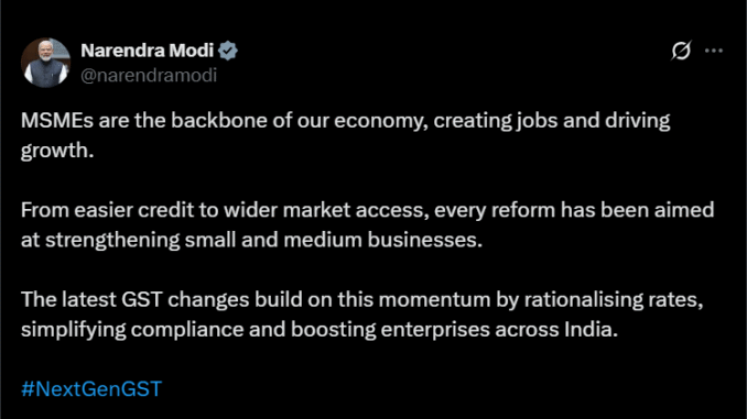 Msme News “MSMEs are the backbone of our economy, creating jobs and driving growth,” says PM Modi September 5, 2025 Rahul Singh 0 Micro, Small and Medium Enterprises (MSMEs) have long been recognised as the backbone of India’s economy—driving job creation, innovation, and inclusive growth. Hon’ble Prime Minister Shri Narendra Modi has once again highlighted the government’s unwavering […]